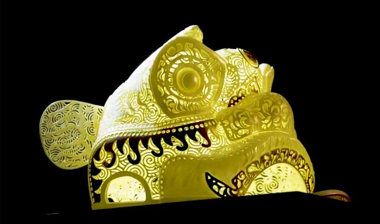 “扎狮头用现在的话来说就是核心技术。传统的扎做真厉害,每一步都影响下一个点,科学的力学结构,可以支撑成年人站上去。如何让现代人一眼就能看到这种力学美?我想到了3D打印技术。”利用3D打印技术,呈现出镂空的狮头扎作“骨架”,祥云纹为底纹,第二层是传统狮头上独有的虎斑纹、草尾纹和唐草纹,第三层是在狮头上体现另一种“非遗”技艺——镶上一篇薄如蝉翼的金箔。打上灯光,在光影效果中,狮头扎作的细致与层次,变得绚丽而更直观可见。