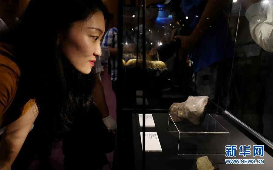 8月25日,参加发布会的媒体记者观看玻璃柜中展示的陨石。 新华社记者 方喆 摄