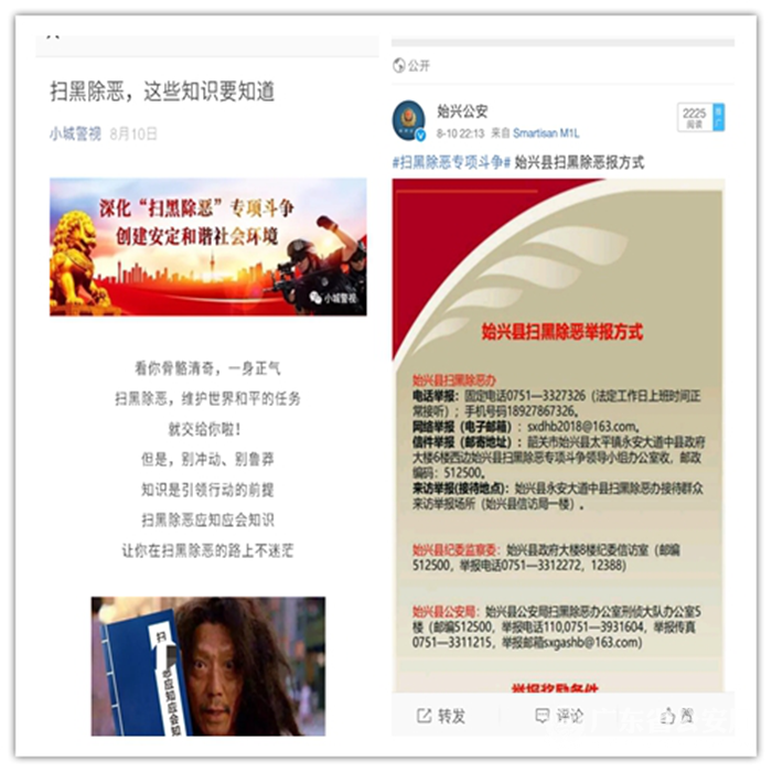 除通过电视、报纸等传统媒体外,始兴警方积极利用官方微博、微信等新媒体,发布关于深入开展扫黑除恶专项斗争的通告,宣传群众举报黑恶势力犯罪奖励办法和实施办法,推送扫黑除恶应知应会知识和典型案例,并设立电话、邮箱、信件等举报方式,赢得了广大市民群众点赞转发,实现了在始兴本地朋友圈多次刷屏。同时,结合当前网络新媒体语境和思维,在现有条件下创新思维制作定格动画,让动漫人物通过以案说法的形式宣传,让扫黑除恶宣传工作多了点Q味,进一步增加了受众覆盖面。