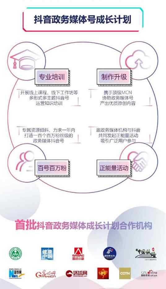 为了帮助更多政府媒体机构利用抖音传播正能量,抖音相关负责人在大会上公布了抖音政务媒体号成长计划。计划由四部分组成,分别为专业培训、制作升级、百号百万粉、正能量伙伴招募。