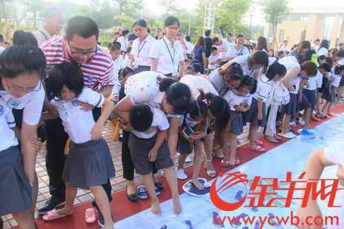 悠扬琴声从小舞台飘出,孩子们身着白色衬衫,男生身着灰色短西裤,女生则穿着灰色百褶裙,依次笔直地站立着。随后,孩子们邀请校长等领导在16米的长卷上印上手印,寓意支持、鼓励,给予学校最有力的支撑。同时,科校第一批二百多位学生,也在卷上印上自己的彩色脚印,寓意着迈出成长的第一步脚印,踏踏实实学习。
