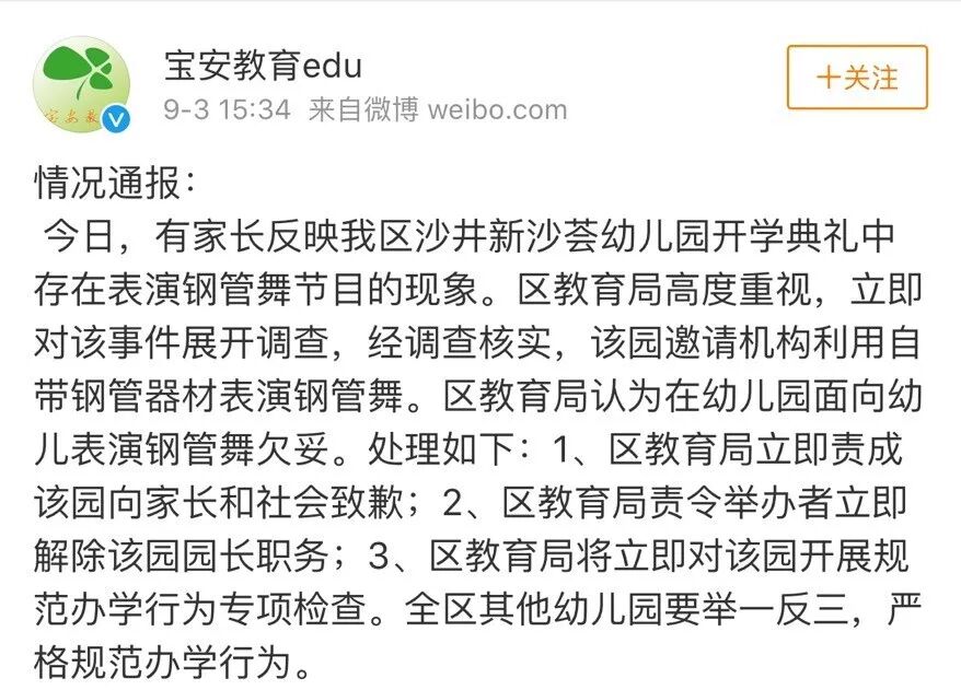 昨日下午,深圳宝安区教育局发布通报称,经查,该园邀请机构利用自带钢管器材表演钢管舞。区教育局认为在幼儿园面向幼儿表演钢管舞欠妥。处理如下: