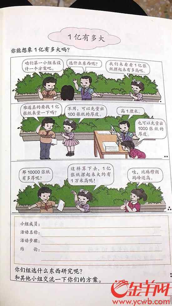 ——该题目是否有发散思维的作用?多名小学数学老师表示,小学四年级第一单元确实有《亿的认识》这一课。记者在广州中黄国际黄埔小学老师佘丽芳发来的一张课本图上看到,几名小学生正在通过测量1000张纸的厚度估算1亿张纸的高度,来认识“亿”的概念。佘丽芳认为,佛山小学这位老师设计题目的初衷,其实是符合认知规律和新课标要求的,通过类比、实践感受数学与现实生活的联系,以此加深学生对数的认知。