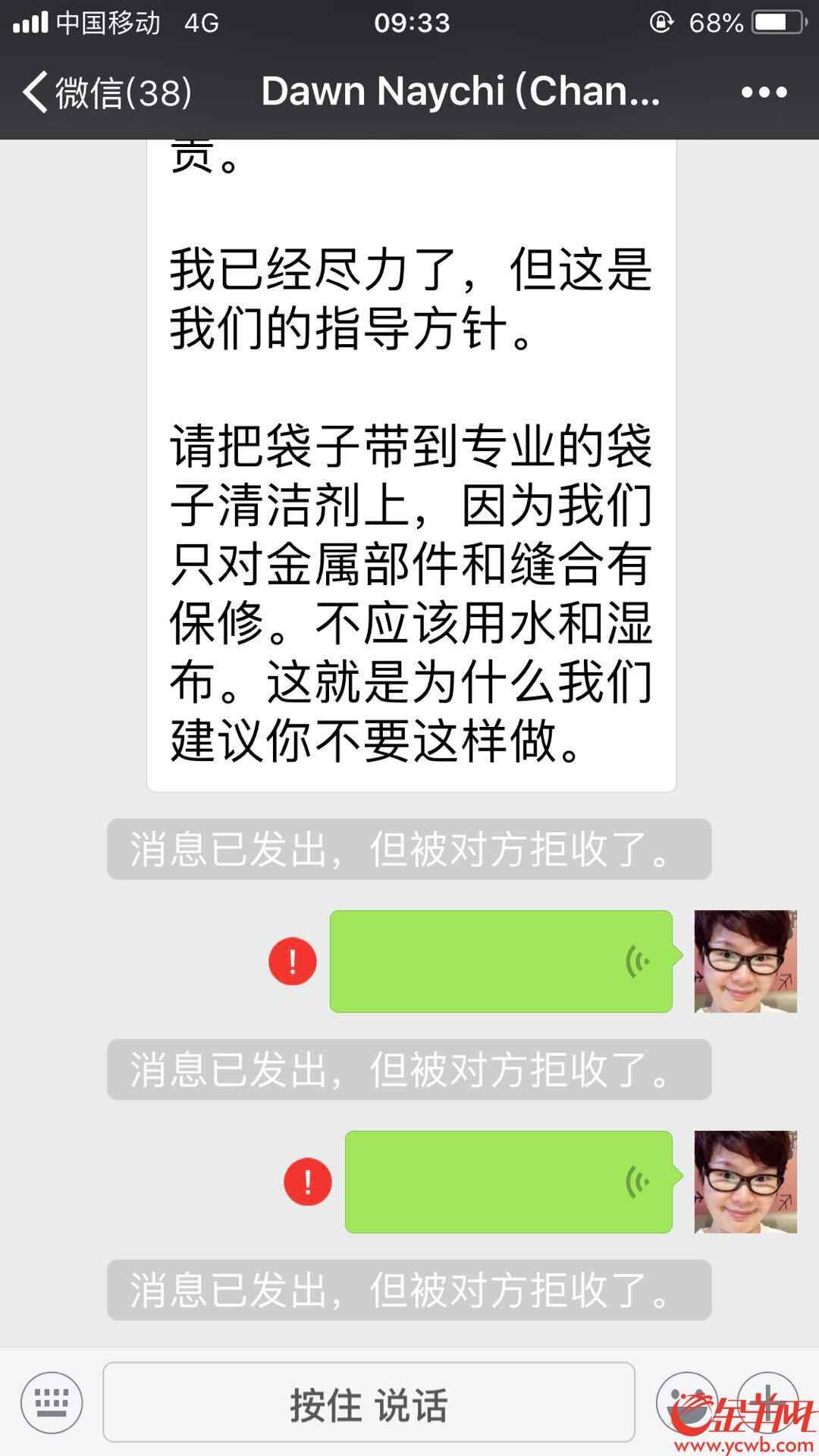 陈女士称,香奈儿方面表示只对金属部件和缝合有维修服务,“皮的问题没办法”。陈女士的朋友也在第一时间联系了新加坡香奈儿售后,从陈女士提供的微信截图可看,疑似客服回应称:“我已经尽力了,但这是我们的指导方针……不应该用水和湿布,这就是为什么我们建议你不要这么做”,之后陈女士朋友再发信息便提示“消息已发出,但被对方拒收了。”