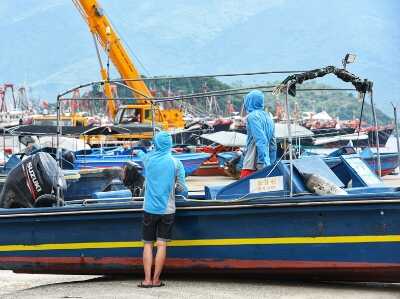 小桂码头,渔民整理渔船以抵御强台风。王磊摄