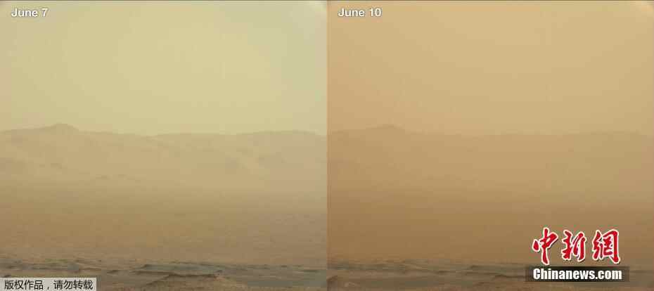 图为采用核动力驱动的火星车“好奇号”所拍摄到的火星表面沙尘暴的情况,从6月7号到6月10号,沙尘暴在不断加剧。其实在2007年的时候,机遇号曾经遭遇过一次沙尘暴,但那一次因为在尘暴到来之前电量充足,加之在沉睡不多久后,就看到了久违的太阳,所以最后被唤醒在火星的表面,一直工作至今,为人类传回了很多美丽的火星照片。