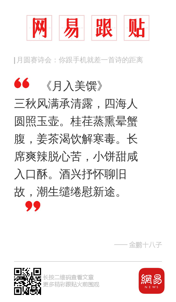 中秋节的你,也许在回家的路上,也许和家人朋友聚在一起享受美食,也许在思念一个不在身边的人,“食”、“行”“忆”永远是这个节日绕不开的话题。自古以来,中秋就有吟诗赏月抒胸臆的传统,而跟贴网友作为网易新闻极为优质的UGC内容来源,不乏有文采、有内涵的现代诗人。他们的文采碰上中秋人月两圆的场景,又会擦出什么样的火花?中秋之际,网易新闻举办月圆赛诗会,寻找月亮下最会作诗的人。