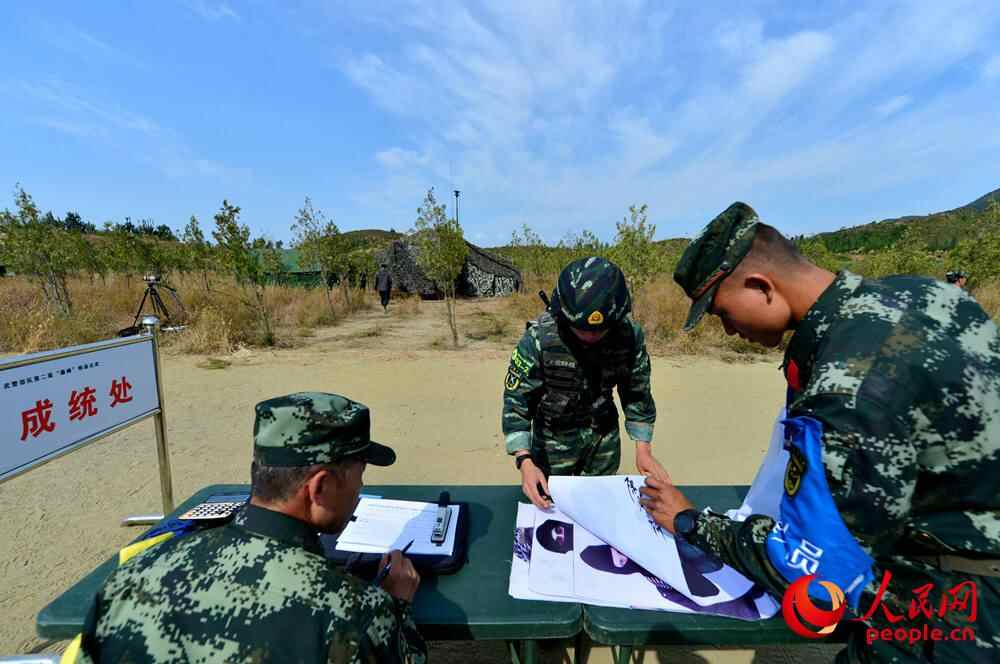 在极限运动搜索射击课目比武中,参赛队员现场查看射击成绩。曹峰摄