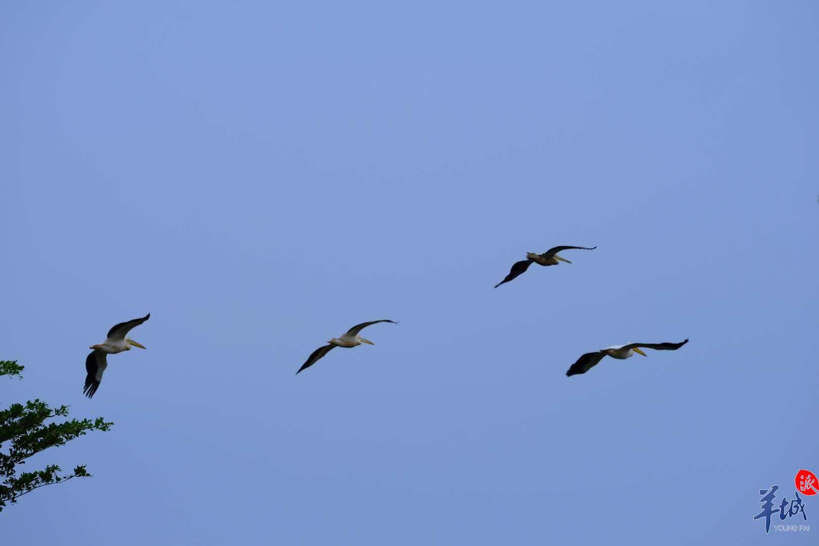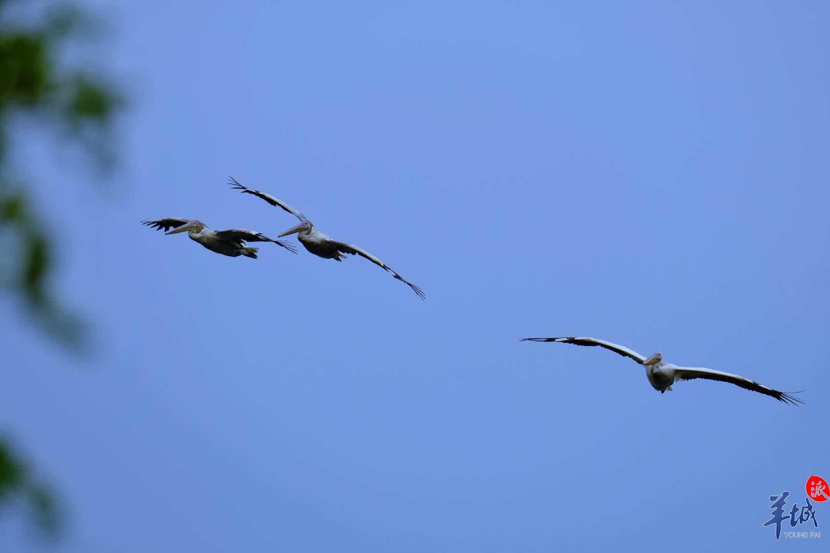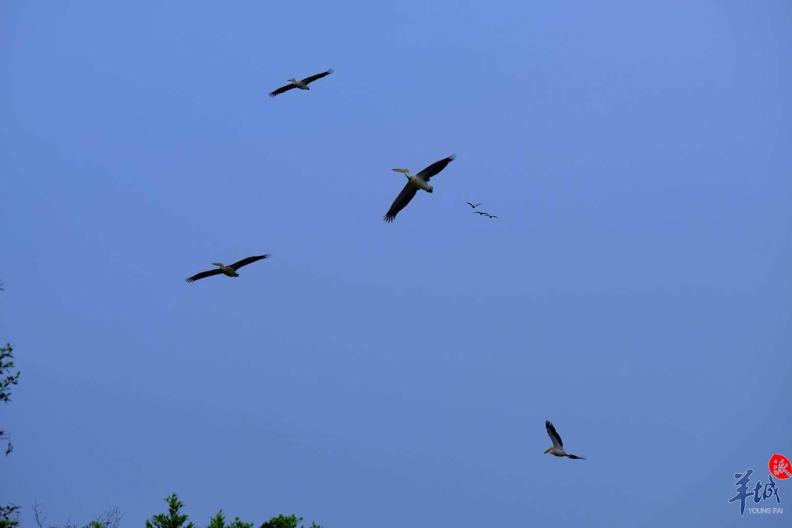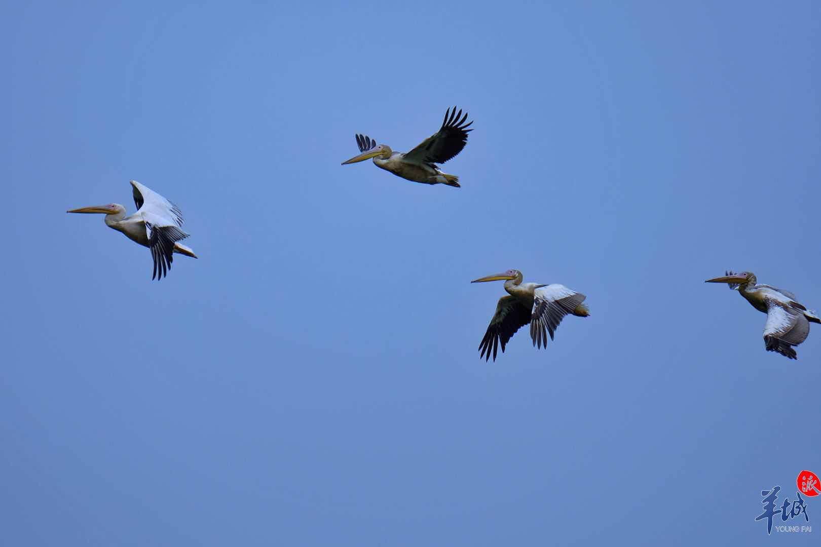 秋天童话,广州南沙鹈鹕、白鹤编队飞
