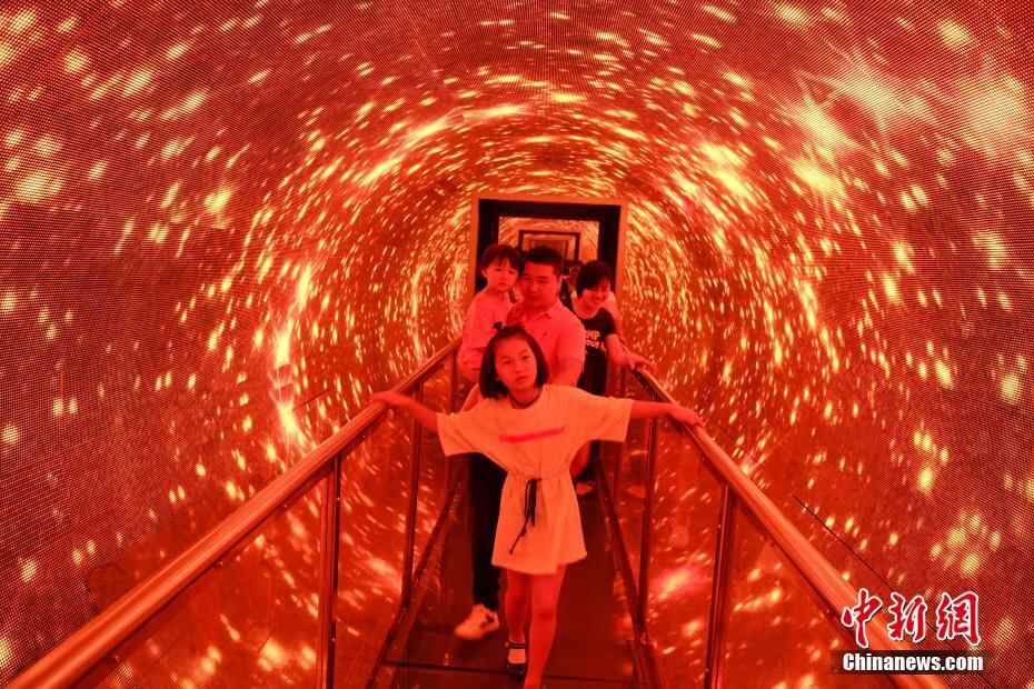 10月3日,福州小朋友到福建省科技馆体验各种科技设备,“充电”过假期。图为小朋友与家长一起体验过时空隧道。中新社记者 王东明 摄