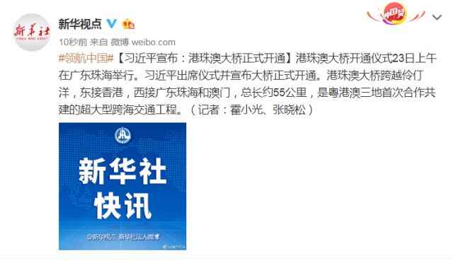 【习近平宣布:港珠澳大桥正式开通】港珠澳大桥开通仪式23日上午在广东珠海举行。习近平出席仪式并宣布大桥正式开通。港珠澳大桥跨越伶仃洋,东接香港,西接广东珠海和澳门,总长约55公里,是粤港澳三地首次合作共建的超大型跨海交通工程。(记者:霍小光、张晓松)