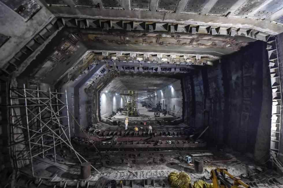 2017年7月7日,港珠澳大桥海底隧道正式贯通。图为施工人员在港珠澳大桥海底隧道最终接头处施工。(视觉中国)