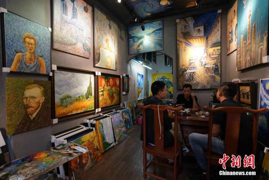 被称为“中国梵高”的赵小勇(中)是大芬村里最知名的画师,20年来临摹了近10万张梵高的作品,自称比梵高还了解梵高的画作。如今他的画从过去的几百元人民币上涨到最贵的1.2万元人民币。工作室里除了他最擅长的临摹梵高作品外,也多了自己的原创作品。他已经不再满足于临摹,开始创作代表自己灵魂的原创作品。中新社记者 张炜 摄