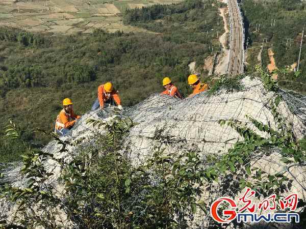 通往“最美乡村”婺源的九景衢高铁线路上有一条梅山一号隧道,隧道顶上是座130余米高的石山,山上数以万记的石块暴露在表面,这些大小石头被钢索“勒”着,远处望去,整座山像是被一张大网给牢牢收住了。检查要从山的正面上去,从背面下来,虽然有检查道,但要细致检查到山体的每个角落,桥隧工们必须系上安全绳,挂上安全吊带,在山体上以“钟摆”的运动方式进行作业,顺着钢索网覆盖到所有石头。检查要从山的正面上去,从背面下来,虽然有检查道,但要细致检查到山体的每个角落,桥隧工们必须系上安全绳,挂上安全吊带,在山体上以“钟摆”的运动方式进行作业,顺着钢索网覆盖到所有石头。当“钟摆”可让鄢国平和工友们吃尽苦头,山上都是石灰石,断口十分锋利,在平坦的地方,他们小心一些还能避开,可山上很多部位坡度都超过了70度,置身在这些几乎垂直的石头网面上,一只手要握紧安全绳和安全带,一只手要拿着检查锤敲打,特别是靠近山顶,百米高空足以让人不寒而栗,稍不注意,身体失去平衡,腿部和手臂就有可能被划伤、刺伤。