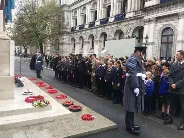 2017年11月11日,30多名华侨华人和英国当地友人在伦敦唐宁街前的阵亡烈士纪念碑前,向在英国付出鲜血和汗水的一战华工敬献花环,这是英国首次在正式活动中纪念参与一战的中国劳工。