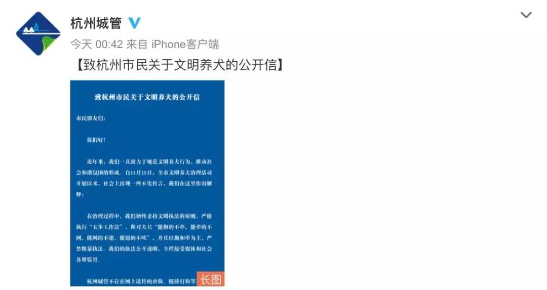 17日凌晨,杭州城管官方发布《致杭州市民关于文明养犬的公开信》,信中表示,本次治理工作的重点是不按规定养犬的人,而不是犬。公开信指出,杭州城管不存在网上谣传的虐狗、棍棒打狗等暴力行为,并重申,本次治理工作的重点是针对出户不系犬绳、不清理狗粪便等不文明养犬的行为,处罚的重点是不按规定养犬的行为人,而不是犬本身。