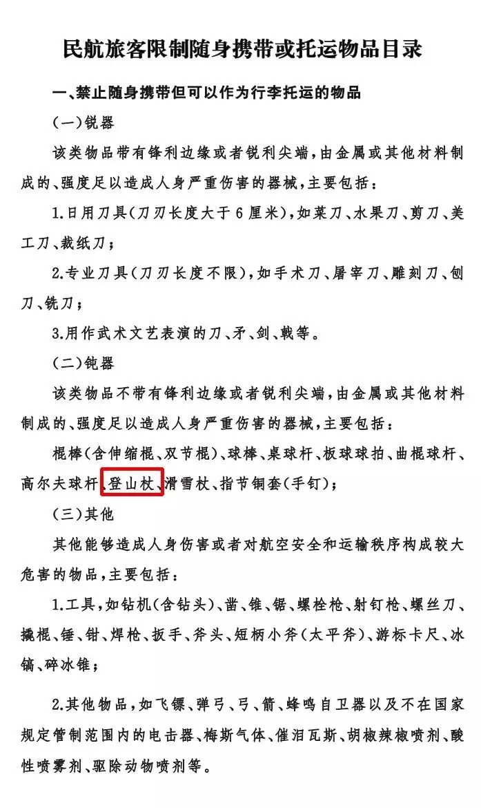 为此,白云安检温馨提醒广大旅客朋友:2017年1月1日正式开始实施的民航安检新规明确规定,登山杖禁止随身携带登机,但可作为行李托运。请广大旅客朋友提前将需要办理托运手续的物品(如登山杖、游标卡尺、工具等)办理托运,以免为您的行程带来不便。