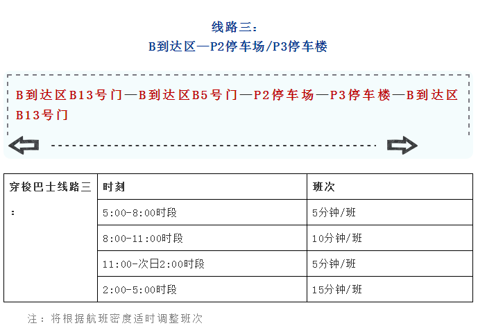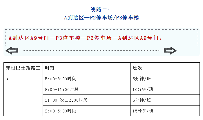 为方便自驾车接人或出行的旅客,自11月30日零时A、B到达区关闭起,白云机场将增设3条免费穿梭巴士线路,24小时为有需要前往T2航站楼、T1航站楼、P1-P5停车场的旅客提供摆渡服务。高峰时段视情况加开车辆班次。