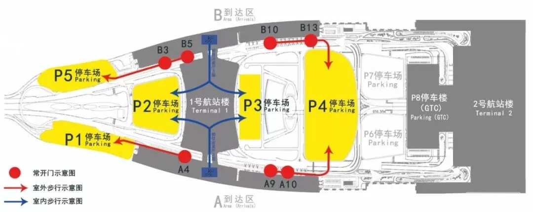 1、A区国际到达的旅客可从A4号门步行约5分钟至P1停车场;