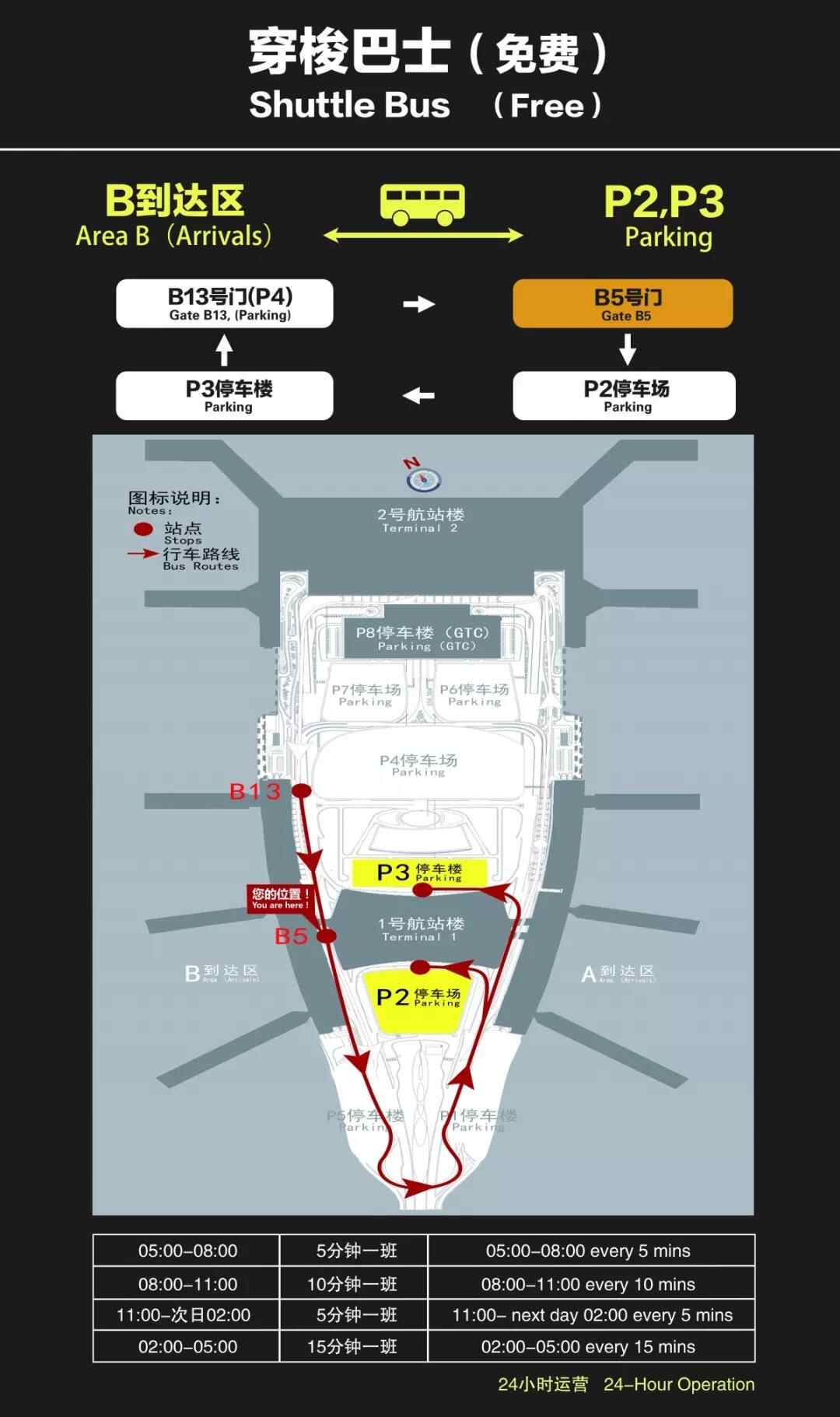 B到达区B13号门(P4停车场)—B到达区B5号门—P5停车场—P1停车场—A到达区A9号门(P4停车场)—2号航站楼54号门