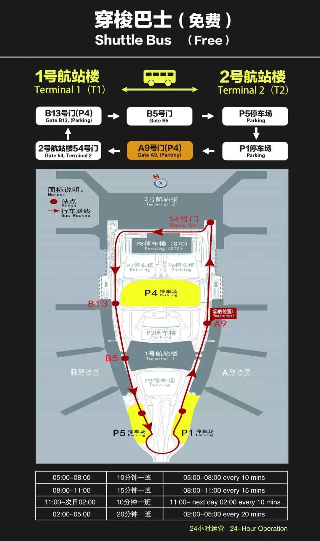 线路一:1号航站楼—2号航站楼(线路覆盖P1、P4、P5)