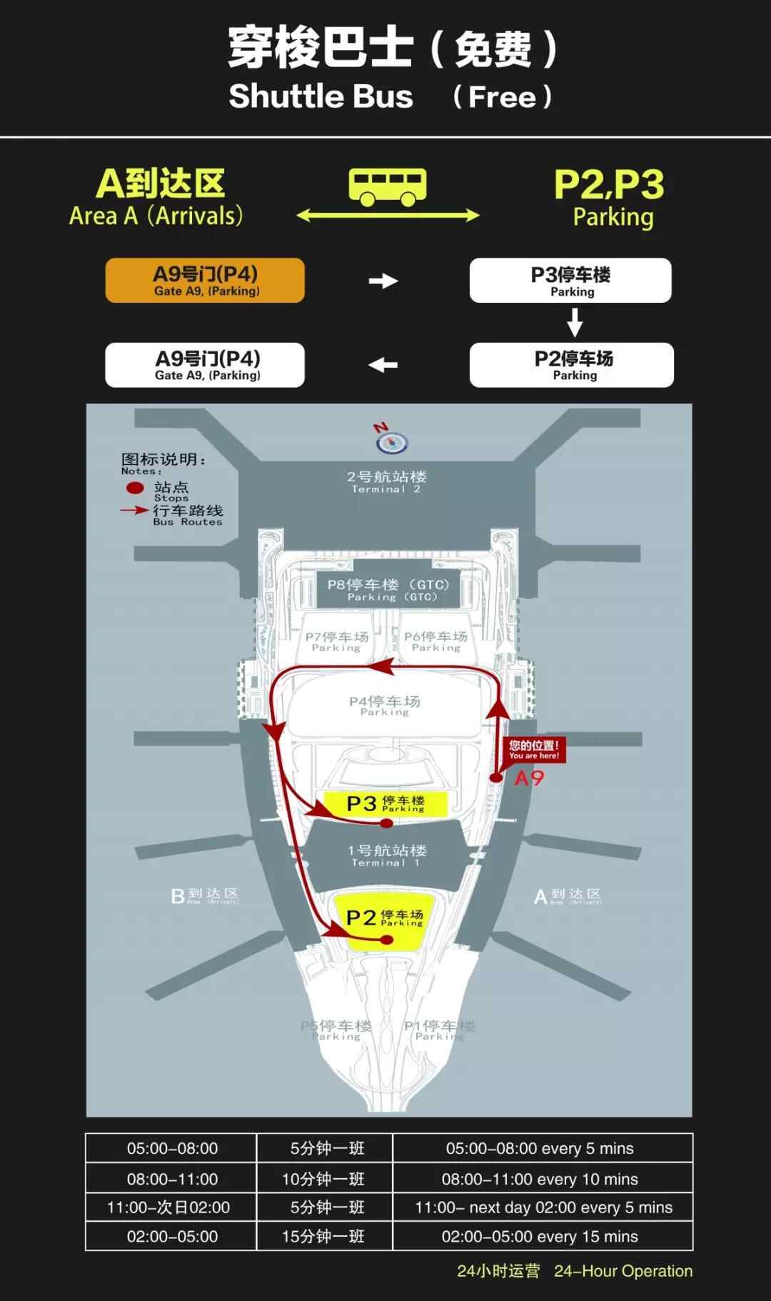 ②如果您乘坐的是A区抵达的国内航班,P4停车场离您最近。接客车辆最好停P4,从到达出口步行至停车场约需5分钟。