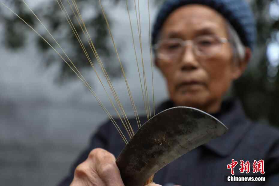 12月3日,宋尔凤老人将竹条劈成细丝。1940年出生的宋尔凤老人是贵州省铜仁市思南县塘头镇红旗村“塘头棕丝斗笠”制作工艺的传承人,她从小就开始学习斗笠制作,现年78岁的她依旧坚持用“细如发丝”的竹子编织斗笠。“塘头棕丝斗笠”制作历史久远,明朝时期就已成为贡品。制作斗笠需要经过选竹、切丝、揉丝、分层、打磨、编织等工序,做工极为精细。 中新社记者 瞿宏伦 摄
