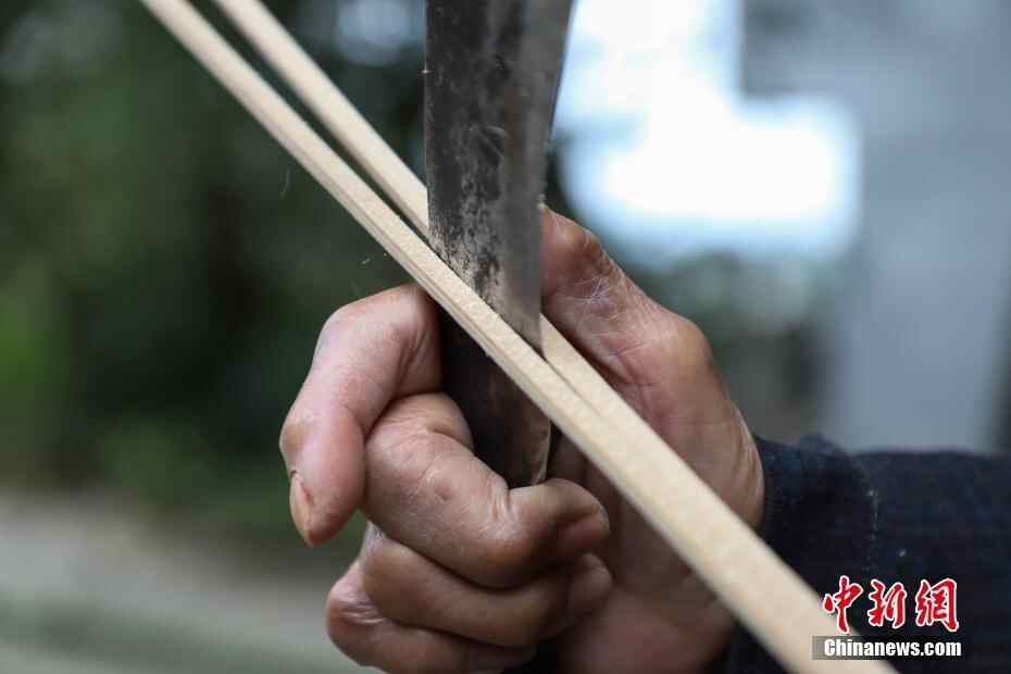 12月3日,宋尔凤老人将竹子切分为两半。1940年出生的宋尔凤老人是贵州省铜仁市思南县塘头镇红旗村“塘头棕丝斗笠”制作工艺的传承人,她从小就开始学习斗笠制作,现年78岁的她依旧坚持用“细如发丝”的竹子编织斗笠。“塘头棕丝斗笠”制作历史久远,明朝时期就已成为贡品。制作斗笠需要经过选竹、切丝、揉丝、分层、打磨、编织等工序,做工极为精细。 中新社记者 瞿宏伦 摄