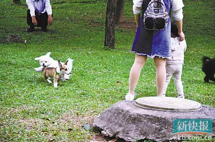 ■草地上,两条小狗在小朋友不远处玩耍。新快报记者肖韵蕙/摄