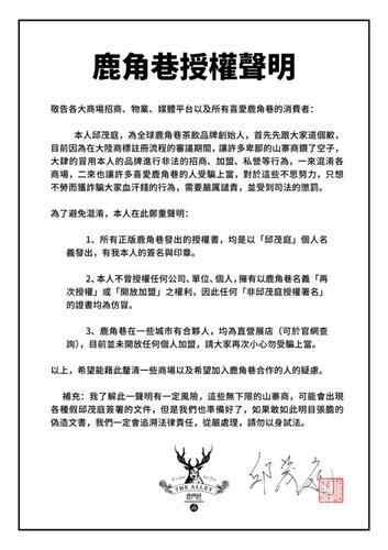 2018年,一家有“鹿头”LOGO的奶茶店铺频频出现在朋友圈、小红书等热门社交app,不少市民前去打卡。记者查询鹿角巷官网发现,目前在广州仅有7家鹿角巷直营店,且该品牌创始人邱茂庭曾发声明,称鹿角巷未开放任何个人加盟,因此在广州大街小巷都看得到的很多鹿角巷奶茶店并非邱茂庭旗下的。
