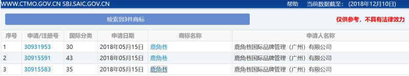 商标真的申请下来了吗?记者查询中国商标网发现,截至12月10日,“鹿角巷”商标申请注册量高达354件,最早的申请为邱茂庭在2017年8月1日提交,处于“驳回复审”状态,也就是说,目前没有商家拿下“鹿角巷”商标。而鹿角巷国际品牌管理(广州)有限公司也曾在今年5月15日对3件“鹿角巷”商标进行申请,目前处于“等待实质审查”状态。