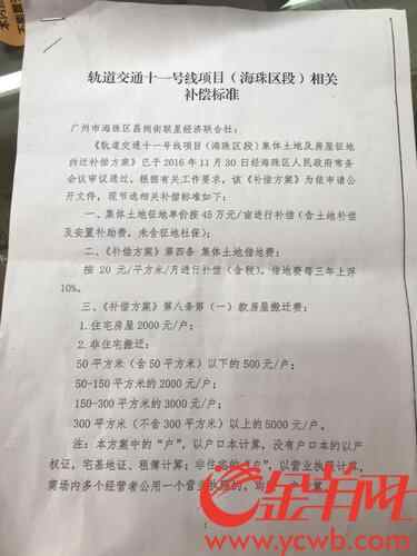 据悉,27日,受影响即将搬迁的商户收到了《轨道交通十一号线项目(海珠区段)相关补偿标准》(下称《标准》),《标准》指出,非住宅搬迁按商铺面积补偿:50平方米及以下补偿500元/户,50~150平方米补偿2000元/户,150-300平方米补偿3000元/户,300平方米以上补偿5000元/户。此外,自建阁楼、水泥地面、围墙、门柱、电话网线等均有相应补偿,还有停产、停业损失补偿。
