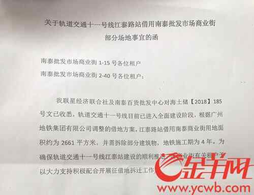 据了解,地铁十一路线江泰路站建设需占用联星联社下属南泰商业街用地面积约2661平方米,拆除建筑物1171平方米(南泰批发市场占地约3万平方米),涉及商铺约30家,地铁施工期为4年。