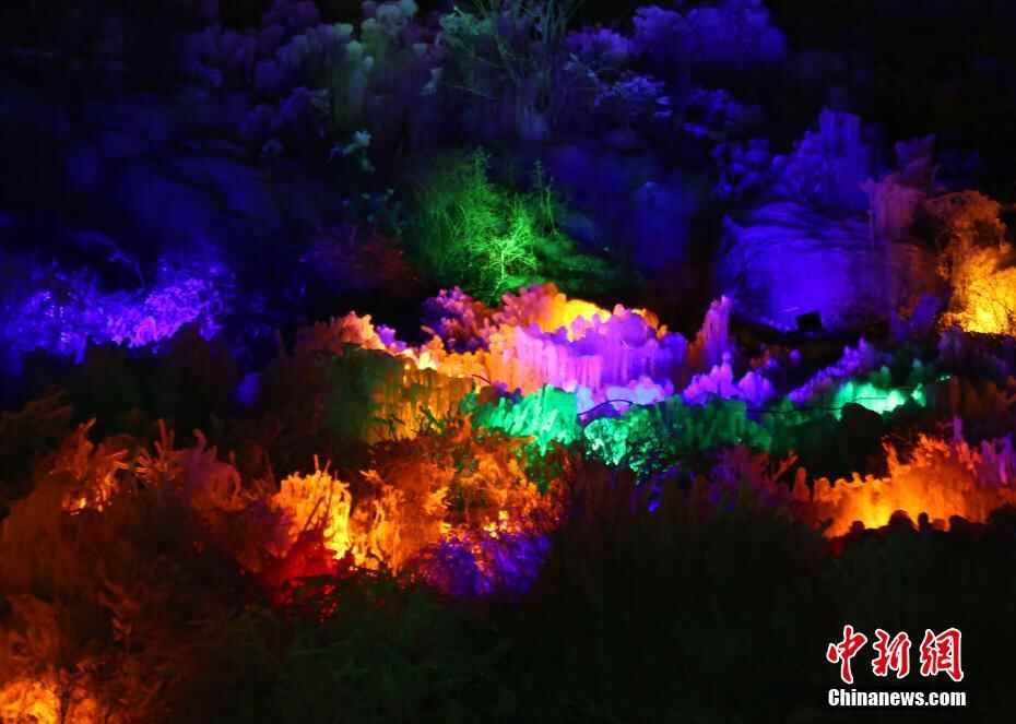 12月20日晚,宗家沟旅游景区内夜间的七彩冰挂。青海省湟源县宗家沟旅游景区内,4万平方米用灯光点缀的七彩冰瀑景观以及拥有冰挂景观的冰洞吸引游客前来观赏并拍照留念。据了解,该景区于明日开展“古城冬韵”宗家沟冰雪文化旅游节活动,向民众宣传、体验乡村冬季冰雪文化,促进该地冬季旅游发展。中新社记者 马铭言 摄