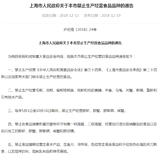 金羊网讯 记者李斯睿报道:为预防疾病和控制重大食品安全风险,上海市政府近日发布了《上海市人民政府关于本市禁止生产经营食品品种的通告》(以下简称“通告”),明确对多种水产品的生产经营进行明令禁止。毛蚶、泥蚶、魁蚶等蚶类全年禁售,醉虾、醉蟹、醉螃蜞、咸蟹在5月1日至10月31日期间停售。