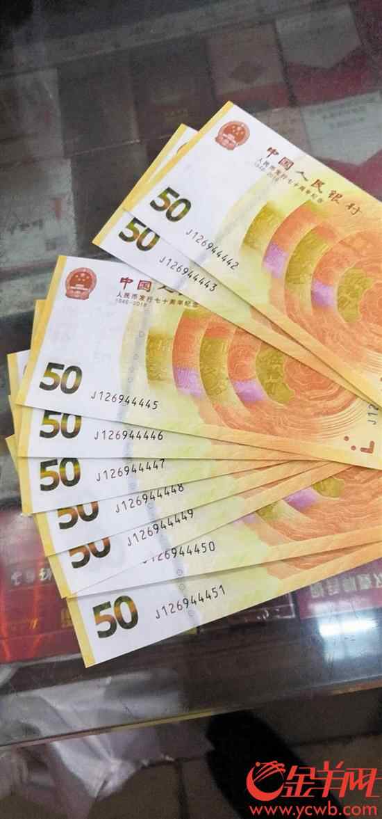 2日,羊城晚报收到市民爆料称,自己在某银行兑换的《人民币发行70周年》纪念钞(下称70周年纪念钞)缺少了中间一张豹子号(注:指钞票尾数号码3个以上相同的)(见上图),怀疑被银行工作人员抽走。据了解,2018年12月28日开始兑换的《人民币发行70周年》纪念钞成为藏市亮点,在电商平台上,单张靓号在60元-70元不等,较面值溢价20%-40%。