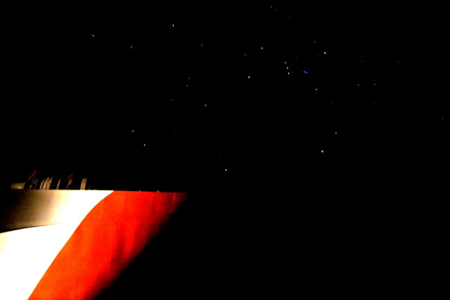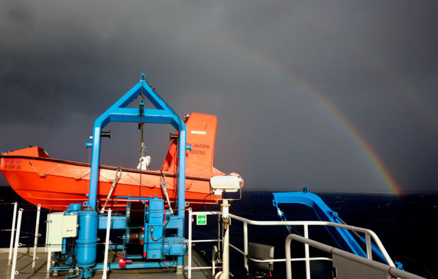 偶尔,天空中还飘来一大片乌云,水汽在海面折射出好几道彩虹。转瞬间,乌云蔽日,下起阵雨。雨过天晴,绯红的晚霞铺满天空,映红整个海面。 凭栏远眺,脚下这一望无际的浩瀚波涛隐藏了多少海底的秘密?
