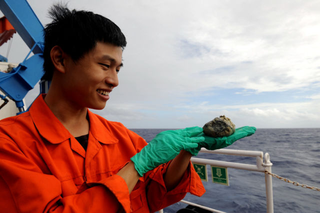 ◆中国“彩虹鱼”2018马里亚纳海沟海试与科考团队首席科学家刘如龙在“沈括”号上工作。