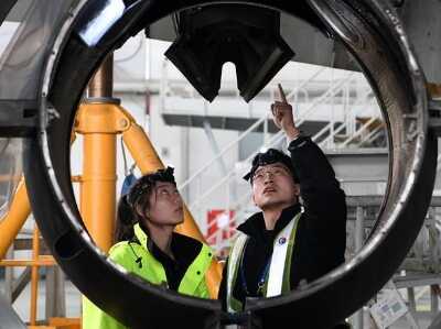 1月4日,在兰州中川国际机场停机坪,杨佳郁(左)跟随父亲杨伟学习航线绕机检查。 新华社记者 范培珅 摄