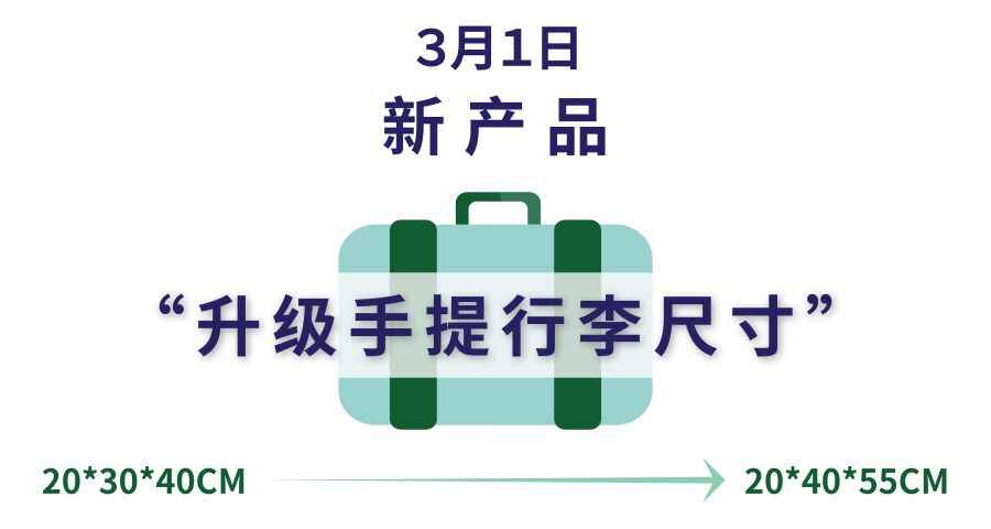 3月1日还将推出一项新产品——“升级手提行李尺寸”。购买该产品和商务经济座机票旅客,手提行李尺寸将从20*30*40CM升级为20*40*55CM,但件数、重量规格不变。