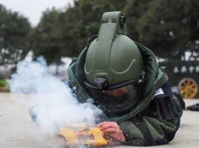 1月14日,搜排爆班武警战士合影留念。当日,武警贵州总队某支队工兵中队搜排爆班进行搜排爆训练,武警战士在冬日严寒中身着重达的60余斤的防爆服进行手动搜爆排爆、机器人排爆和手动拆除爆炸装置等课目的演练。中新社记者 瞿宏伦 摄