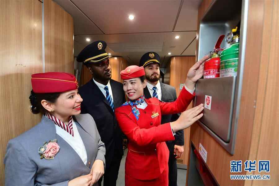 1月20日,在西安北站动车组列车上,列车长(左三)向留学生志愿者讲解消防器材使用方法。当日,西安交通大学三名外国留学生志愿者来到西安北站,在中铁西安客运段工作人员指导下,熟悉动车组服务设施,了解高铁列车员工作流程。春运期间,外国留学生志愿者将登上西成高铁列车,与出乘班组共同服务旅客。新华社发(唐振江 摄)