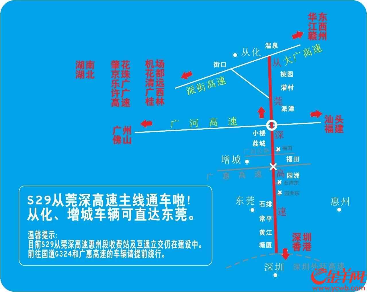 金羊网讯 记者张豪 通讯员从宣报道:28日上午,从莞深高速惠州段主线贯通,这意味着,等了足足8年,从化、增城、东莞和深圳4座城市的从莞深高速公路(S29)终于全线通车!从化的街坊驾驶车辆可直达莞深地区,时间可以节约1小时!