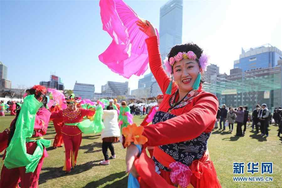2月2日,在日本大阪举行的“2019大阪春节祭”上,前来参加庆祝中国农历新年活动的华侨华人表演秧歌。 中国传统新春佳节临近,很多国家和地区举行多种多样的活动,披红挂彩中洋溢起浓浓的中国年味。 新华社记者 杜潇逸 摄