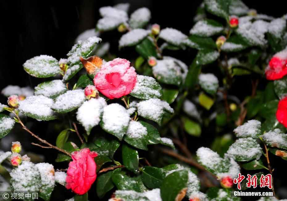 2月8日凌晨,苏州市领秀江南小区茶花上飘落的皑皑白雪。王建中 摄 图片来源:视觉中国