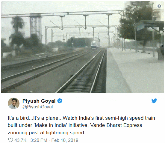 1, 印度铁道部长戈亚尔很高兴,为配合印度最快国产列车“Vande Bharat Express”即将运营,他特意在推特贴出火车运行的12秒视频,感慨于印度制造的“闪电速度”,他这样写道: