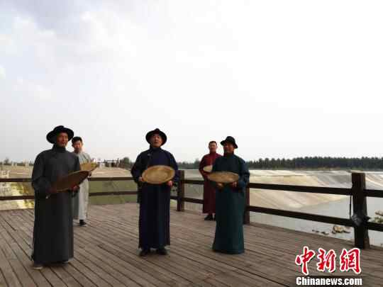 图为端鼓腔传承人丁立新及其团队在湖边表演端鼓腔。 苏本善 摄