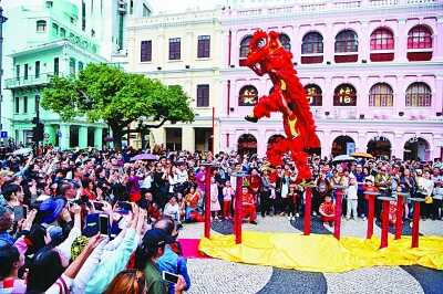 演员在澳门议事亭前地表演舞狮,吸引不少市民观赏。新华社发