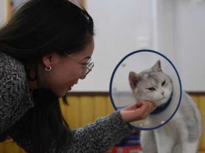 2月28日,工作人员在给猫喂食。在浙江杭州,一家拥有60余只猫的撸猫馆走红,受到年轻人与爱猫者的热捧。中新社记者 王刚 摄