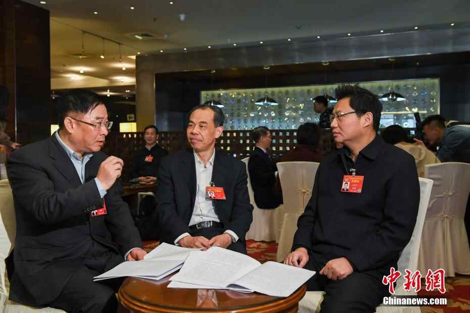 3月2日,全国政协委员李修松(左)、夏涛(中)、刘明平(右)在北京就农业科技等相关问题进行交流。全国政协十三届二次会议将于3日在北京开幕。中新社记者 张娅子 摄